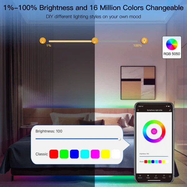ریسه نور هوشمند برند MOES با قابلیت WiFi و نور RGB، فضایی مدرن، شاد و دکوراتیو برای خانه و محیط کار شما ایجاد میکند. با اپلیکیشن TUYA یا Smart Life، میتوانید از راه دور کنترل رنگ، شدت نور و افکتهای نوری را در دست بگیرید، یا با فرمان صوتی از طریق Alexa و Google Assistant نور را تنظیم کنید.